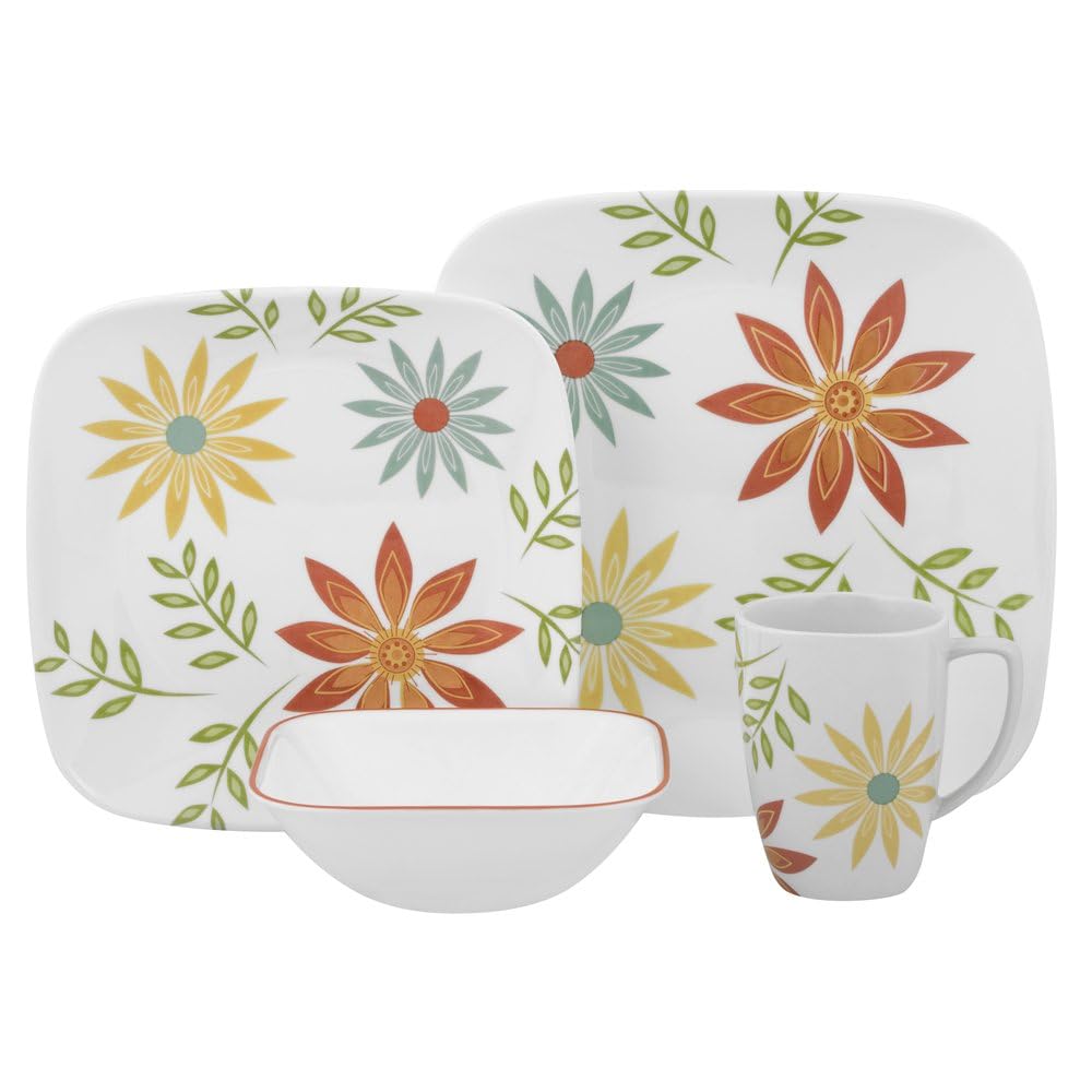 Corelle Square 16-Piece Set, Service for 4, includes 4 each 10-1/4-inchDinner Plates, 8-3/4-inch Luncheon Plates, 22-ounce Soup/Cereal Bowls,12-ounce Porcelain Mugs, Happy DaysProduct Features