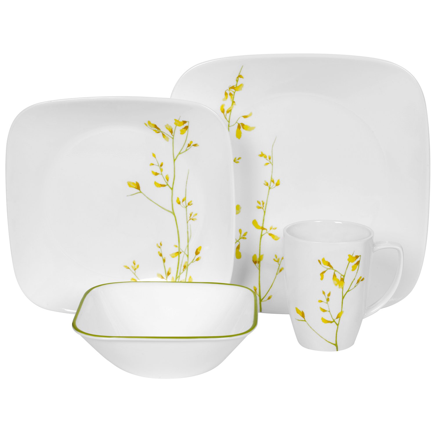 Perfect for creating a nicely affordable yet truly contemporary table, this 16-piece Kobe dinnerware set features delicate yellow flowers that contrast nicely with the bright white base and the dinnerware's square shape. This 16-piece dinnerware set includes four complete place settings, each with a 10-1/4-inch square dinner plate, 8-3/4-inch square luncheon plate, 22-ounce square soup/cereal bowl, and 12-ounce porcelain mug. The dinnerware's exceptional durability comes from Corelle's unique lamination process that thermally bonds three layers of glass, resulting in lightweight pieces that resist chips, breaks, and stains. The set goes safely into the dishwasher, oven, and microwave and is backed by a three-year limited break and chip warranty.